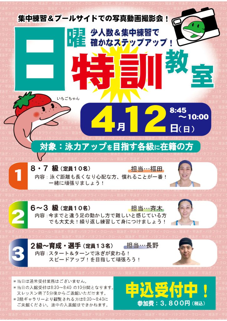 🟢6〜3級(定員10名) 背泳ぎ・平泳ぎ・バタフライのポイントを徹底練習しましょう!